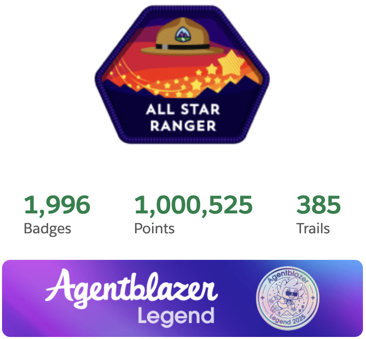 I am super happy to have finally reached the milestone of 1,000,000 points on Trailhead. This is a pretty rare achievement - SuperQbit shows fewer than 50 people have made it so I’m comfortable saying fewer than 100 people really have this (allowing for not everyone being on SuperQbit). That means this is rarer (but not harder or more valuable) than CTA!